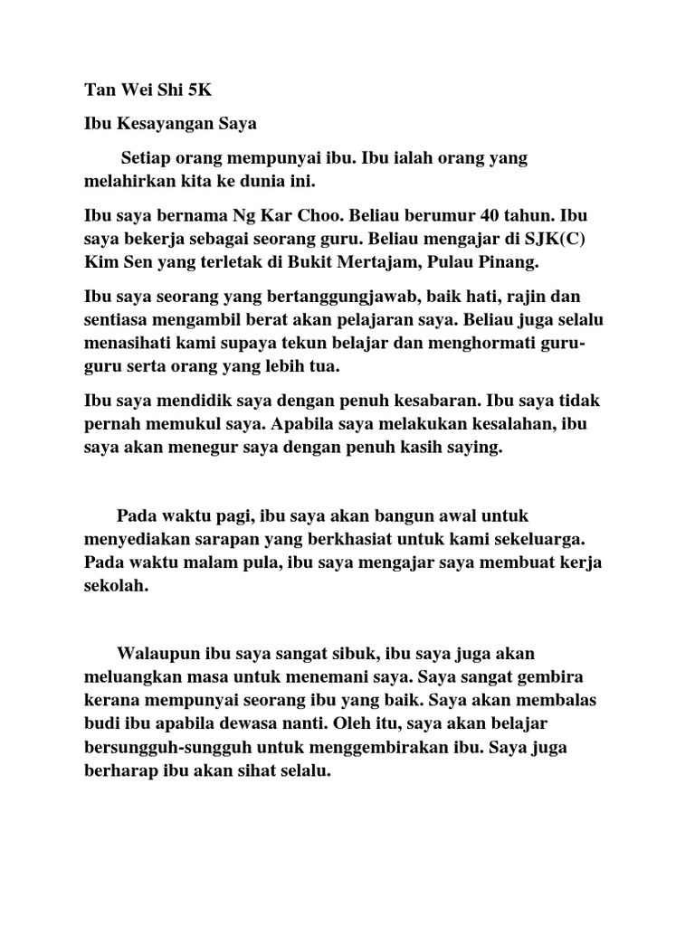 Ibu saya contoh karangan tahun 3 zafrina. Perkenankan saya memperkenalkan tentang diri. Pada cuti sekolah yang lalu saya telah berpeluang pulang ke kampung datuk dan nenek saya yang terletak di Pasir Puteh Kelantan.
